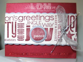I hope you enjoyed Thanksgiving, have consumed the leftover foods and are ready to prepare for Christmas. Shopping on the day after Thanksgiving put me into the holiday spirit, so I'm sharing Christmas cards with you this week. This card was made with Prism's shimmery cardstock, which is pretty and elegant. Luckily, SU! has a coordinating ink color in Bravo Burgundy, so I could use the "All About Christmas" wheel. If you have alot of cards to prepare for Christmas, a wheel set makes the time pass quickly. I highlighted the word "peace" by punching it out of the sentiment piece and layering it onto Shimmery Silver cardstock. All of this was mounted onto a scalloped border of Shimmery Silver cardstock, which SU! produces. Metallic silver organdy and cording were tied around the main image and a little paper-piercing was added to the lower portion of the card. Taking a suggestion from a friend, I made several different Christmas cards this year and it made the process more enjoyable. I made a few of each card and didn't get bored with it, as I've done in previous years.